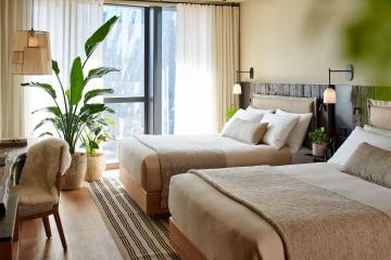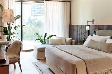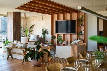At one with nature from the inside out, 1 Hotel Melbourne invites calming moments of reflection on the Yarra River’s north bank. The glass-fronted façade is just one of the many sustainable elements of this biophilic build, which brings together ample natural light, living greenery, and organic materials under its glittering roof. In-room yoga mats, deep soaking tubs and a Bamford-backed spa enhance the urban quietude, with organic plates to graze on and botanical cocktails to sip, served across its down-to-earth eateries.