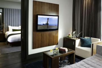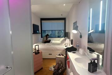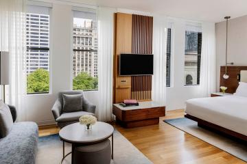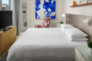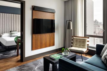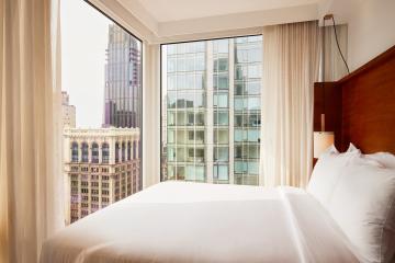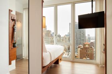 The citizenM hotel room provides everything you need for a great night's sleep, and an even better night's entertainment. Here’s what to expect from your stay at our Times Square hotel in New York City: XL, king-size bed with fluffy pillows wall-to-wall window with blackout blinds anti-jet lag rain shower smart TV with Wi-Fi streaming options ambient mood lighting to rival Times Square triple glazing and sound-proof walls for snoozing. Absolutely no trouser presses, bellboys, or other tired old hotel clichés.