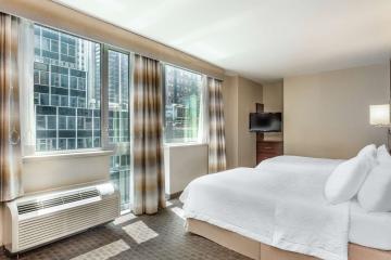 The Hampton Inn Manhattan-Times Square North is a contemporary hotel conveniently located in the heart of Midtown on Eighth Ave. at 51st St. The hotel is surrounded by Broadway theaters and is in walking distance to attractions such as Carnegie Hall, Lincoln Center, Central Park, Restaurant Row, Rockefeller Center, The Museum of Modern Art and Manhattan’s best shopping. The Hampton Inn has 300 oversized guest rooms (including 150 rooms with 2 queen beds) with modern amenities including 32-inch flat screen TV and plush bedding. Amenities include a Fitness Center, in-room and lobby internet access and 24-hour coffee / tea. 24-hour Security is onsite.